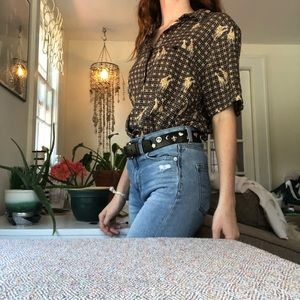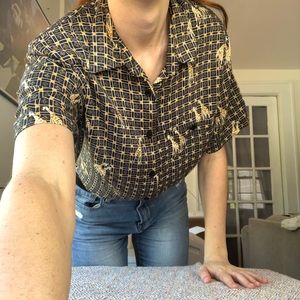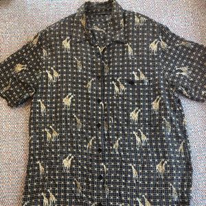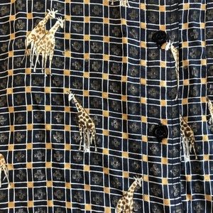 Size small giraffe button down. This shirt can be either men’s or women’s. The shirt has shoulder pads that can easily be removed if not wanted. This shirt is super cute and super trendy right now!