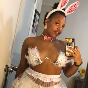 This Halloween costume comes with a custom bra, skirt, bunny ears, and bow tie! All white the bra fits multiple different sizes around 28-34.