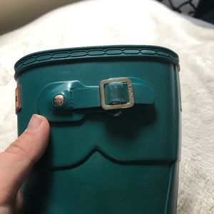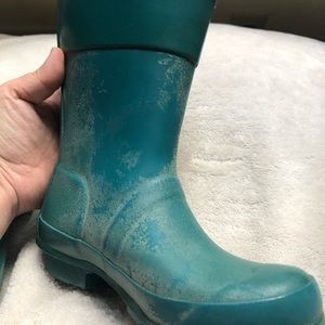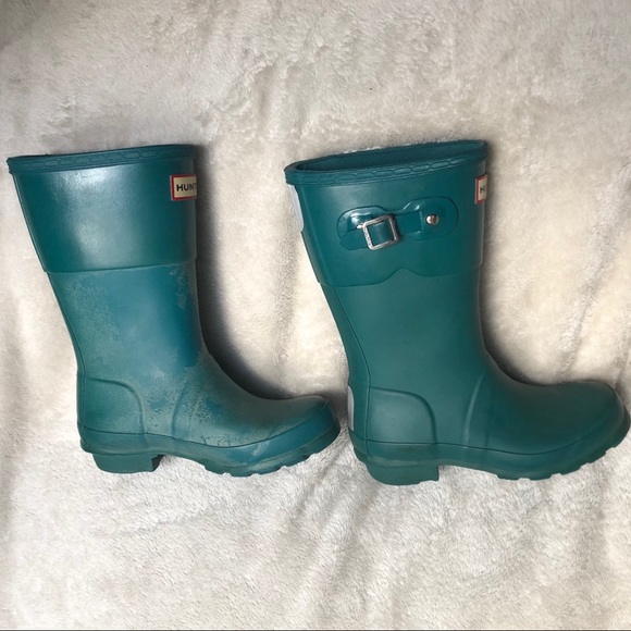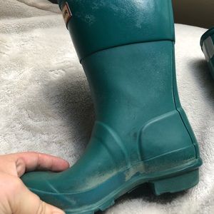 Beautiful color of boots, just some blooming has occurred. Hunter sells some oil that can apparently fix this natural white blooming, I just don’t want to purchase it. My loss your gain. Size 1 girls or 13 boys.