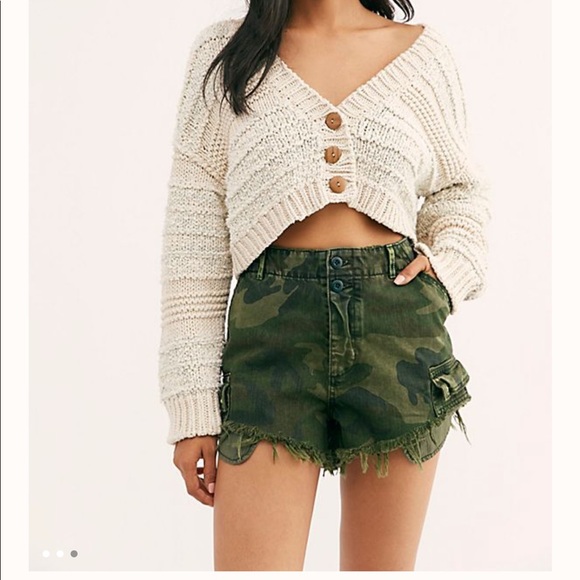 NWT. Never worn. Camp printed twill high-waisted cargo shorts with raw hem, four-pocket style, button fly and double button closures on the waist band.
