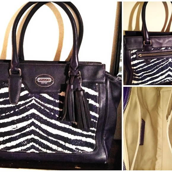 Beautiful deep bold purple leather with zebra print. Well taken care of used bag and comes with dust bags