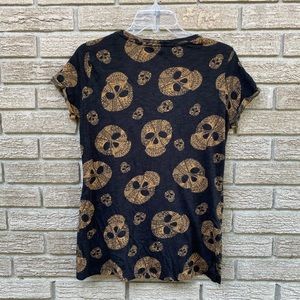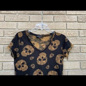Rock and Republic black shirt with yellow / gold decorative skulls. Asymmetric / high low shirt that’s shorter in the front, longer back. V neck with folded sleeves. Super soft, excellent condition with no stains or holes. Perfect for halloween, day of the dead.