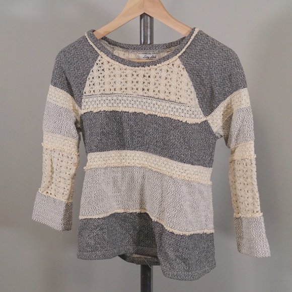 This is a soft "patchwork" sweater from Lucky that was only worn a few times so it is in great condition. The sweater hits a bit below the waist line so it is easy to tuck into jeans. It should be noted that the shoulders are a little narrow so it you have wider shoulders it may not fit you properly.