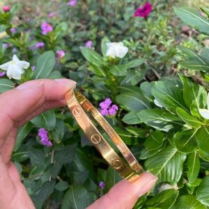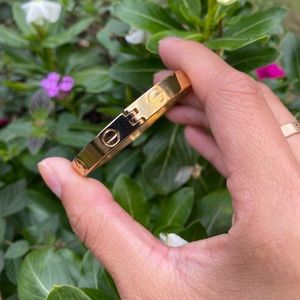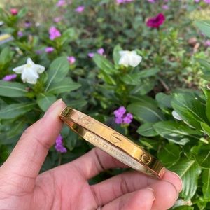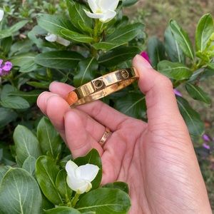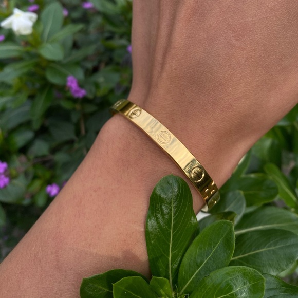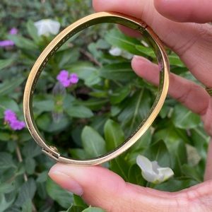 18k gold electroplated, size medium, 2.5 inch across. Good condition considering age , but as with any bracelet that’s from the 1970’s there are sections that shows gold fading.