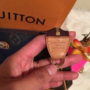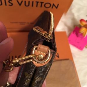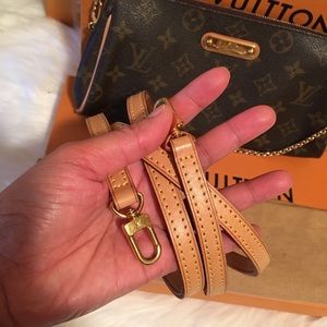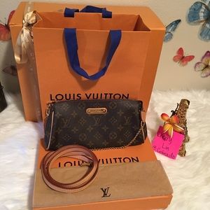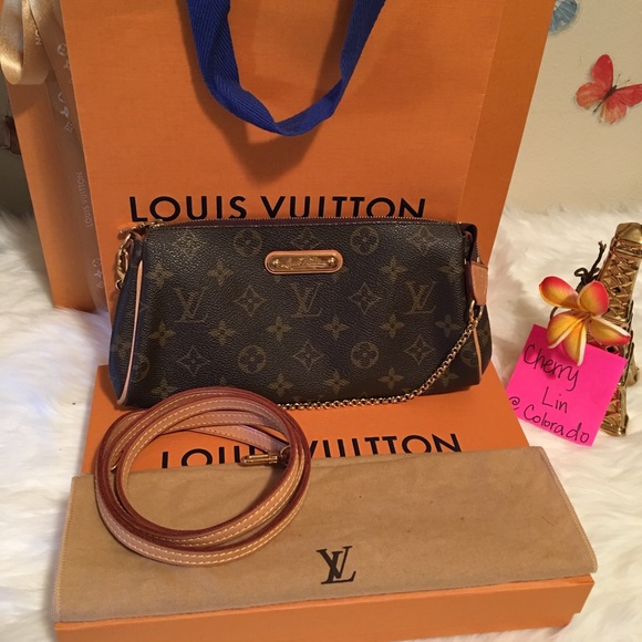 This clutch features an elegant polished brass chain wrist strap,an optional vachetta shoulder strap,vachetta leather trim and a Louis Vuitton signature name plate.