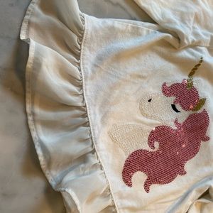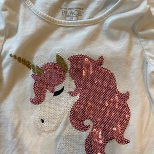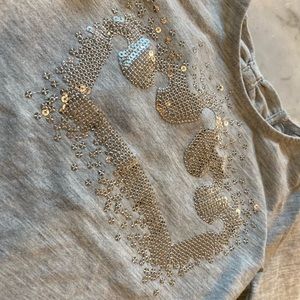 1) White peplum style with sequin unicorn design 2) Grey with silver sequin crown design. Both have lots of life left!
