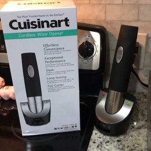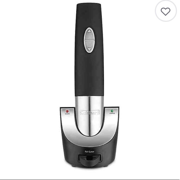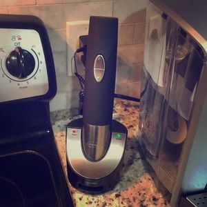 Cordless electric wine opener with charging stand. Has stainless steel accents. Makes opening a bottle of wine super easy.