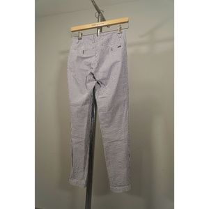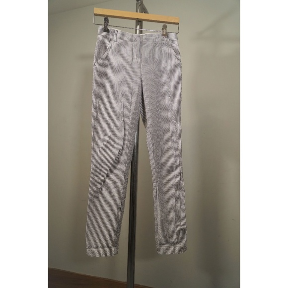 These are a pair of navy and white Armani Exchange Pinstriped Trousers in a size 0. They have 4 pockets and the back pockets close with a button. They have only been worn a few times so they are in great condition. The stripes show up a little strangely on Poshmark, they look a lot better in person. These are great work pants.