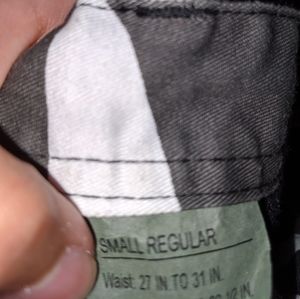 Size small camo pants with adjustable waist and dwarstring at the bottom of pants as well. INSEAM: 26" WAIST: 27"-31"