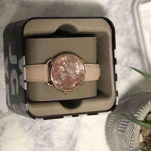 This 35mm Tailor features a marble-inspired blush dial with stick indices, three-hand movement and blush leather strap.