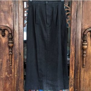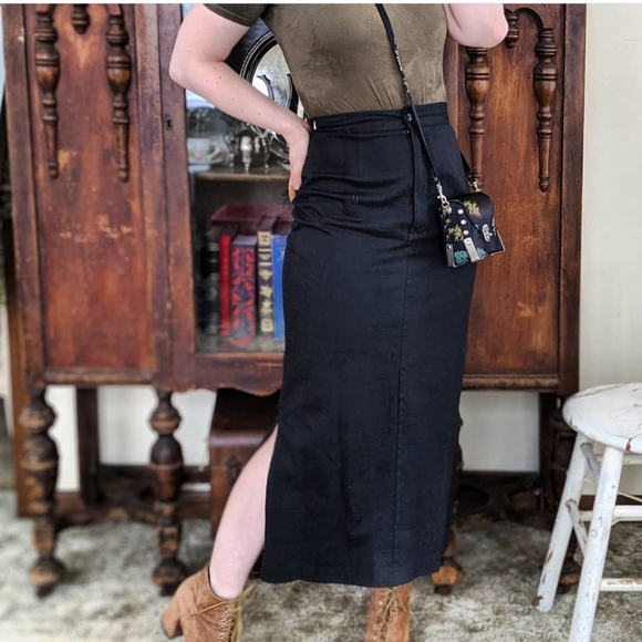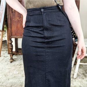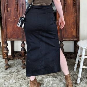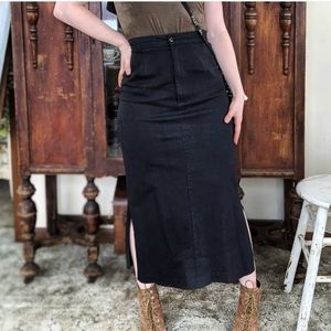 A simply sexy and perfect piece to match with almost any outfit! A very high quality vintage brand! Form fitting long black skirt with fun slits up both sides. A very comfortable and flattering piece! Skirt does have stretch to the fabric!