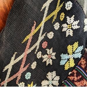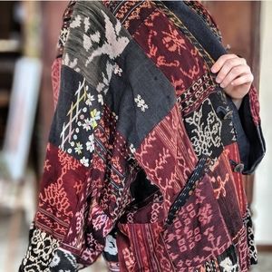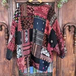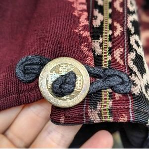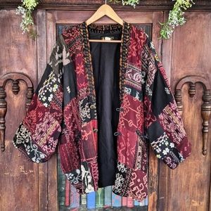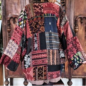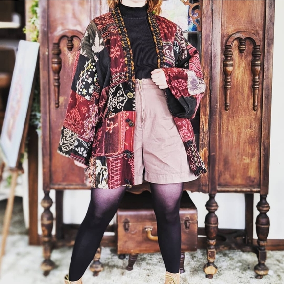An unique one-of-a-kind statement piece. Having a hard time listing this one! A truly gorgeous made jacket with so many stunning fabrics! Has 4 buttons up the front, made from what looks like possibly Chinese coins the hook into fabric loops. So comfy and warm as well! Made of 100% cotton. Also has pockets!