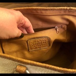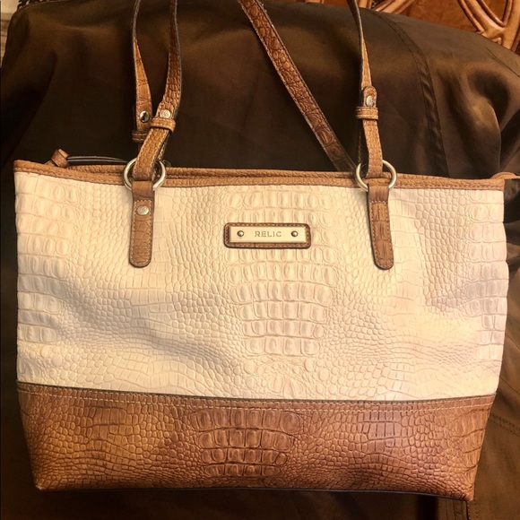 Beautiful cream & brown alligator embossed leather tote style purse. The cream color is slightly iridescent- really nice.