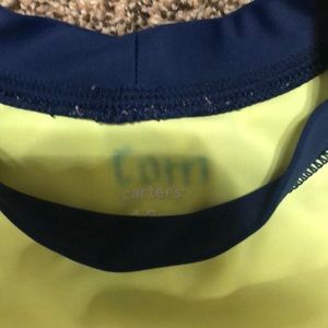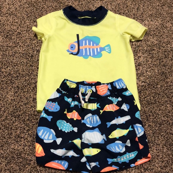 Trunks and rash guard. Does have my son’s initials written at neck