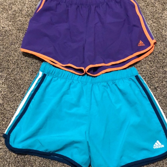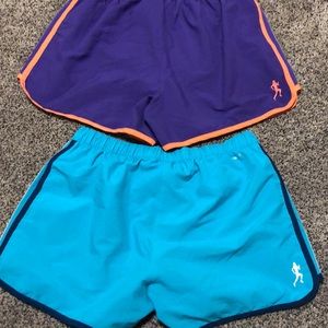 2 pairs. One pair purple with orange and gray stripes. One pair teal with dark turquoise and white stripes. Excellent condition. SFPF home,