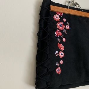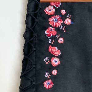 black suede skirt w floral deisgns on the side. also has ties on the side that can adjust to ur body. fully functioning zipper in the back #NWT