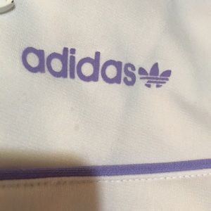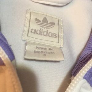 Beautiful lavender and white track jacket. Perfect condition except a very very small piece of logo is missing and there is a very faint dot under the logo. Size S. True to size