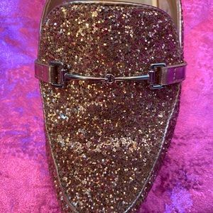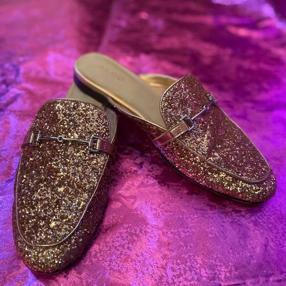 #ALDO #slipon #mule - size 7.5. #Rosegold #glitter upper with rose gold and metal embellishment. Worn 3 times, in great condition except for very back of heel on both shoes (shown in photo) - shoes were too large and wear is from dragging.