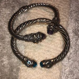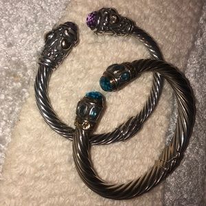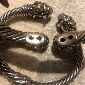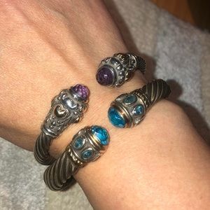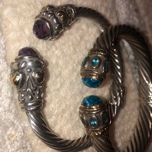 Selling as a bundle two sterling silver bangle cuffs adorned with amethyst and topaz gem