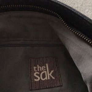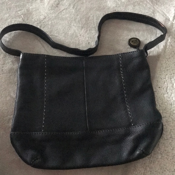Black leather very roomy...zipper on inside of bag. Good condition except for some noticeable wear on shoulder strap.