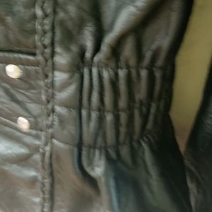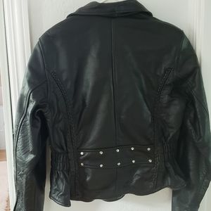 Women's black leather motorcycle jacket with braid, zip-out lining, and gather sides.
