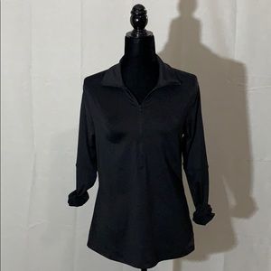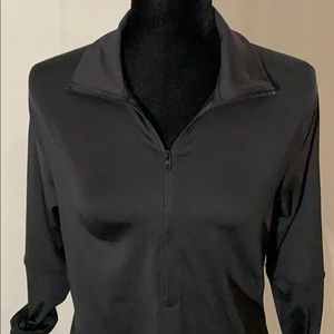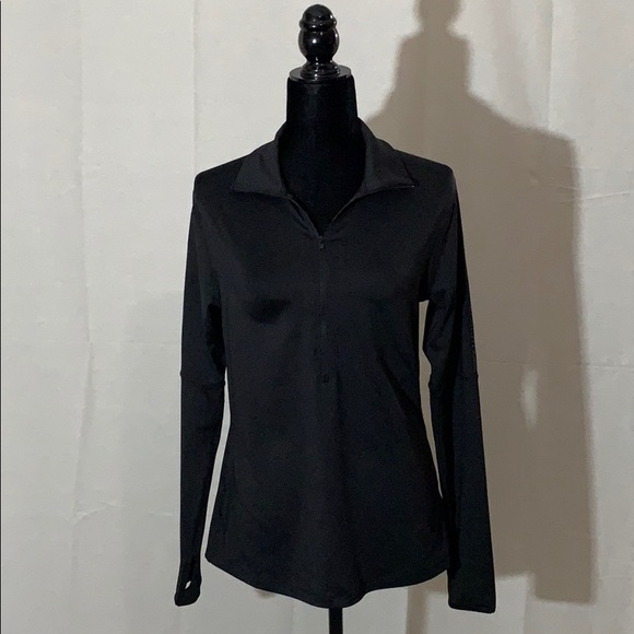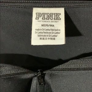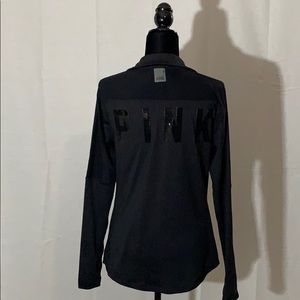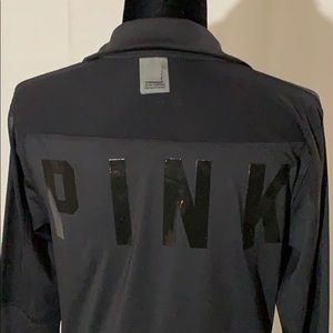 Shiny black with black lettering on the back that reads “Pink” with mesh on the back and arms and thumb holes. Brand new without tags.
