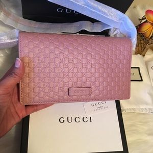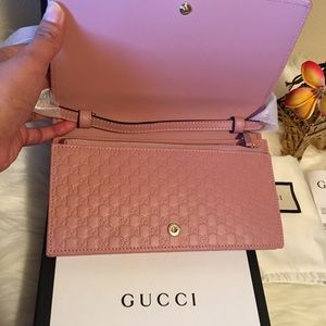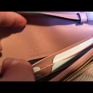 The shoulder bag features a removable leather shoulder strap and a flap that unsnaps to a matching leather interior with billfolds, credit card slots, and a zipper compartment. This is an excellent wallet for everyday necessities, with the timeless style of Gucci!