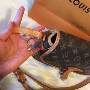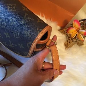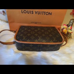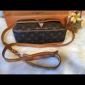This cross-body bag is crafted of Louis Vuitton monogram on toile canvas. The bag features natural vachetta cowhide leather trim, and an adjustable shoulder strap with polished brass hardware. The crossover flap opens with a belt buckle closure to a cocoa brown fabric interior with a zipper pocket. This is a casual and stylish everyday shoulder bag, from Louis Vuitton!
