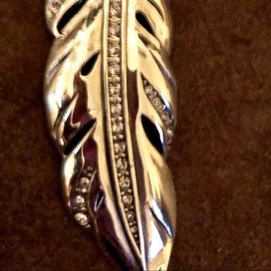 -Contempo Ice, inspired by wintry icicles, takes a lofty turn with this delicately beautiful feather, shimmering with Swarovski. Reverses to an all silver motif, and can be doubled and worn short.
