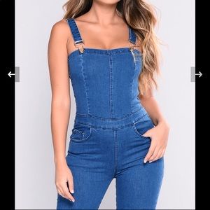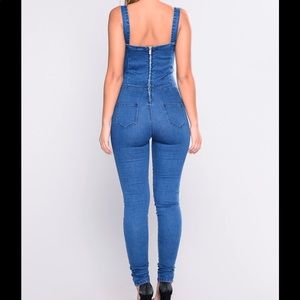 Available In Medium Wash Denim Jumpsuit 5 Pocket Design Great Stretch Zipper Back 80% Cotton 18% Polyester 2% Spandex