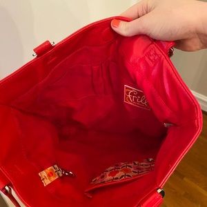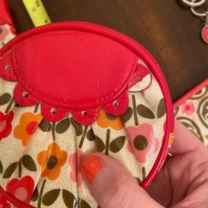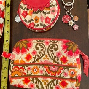 Adorable VB frill set! In great used condition! I’ve looked it over carefully as it’s been well loved and tried to include pictures of the minimal wear. It is a used set but still has a lot of life left! The main bag has a plastic coating that makes the bag versatile and easy to keep clean! Matching key chain and two pouches.