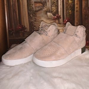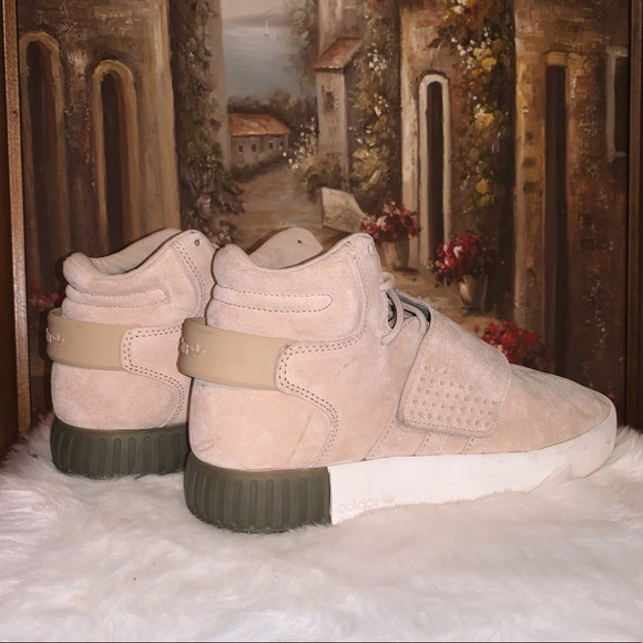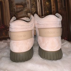 High top slightly platformed cream/tan white and army green adidas shoes. These are no longer sold on the website and have only been worn once, only sign of wear is a bit of discoloration on the soles and a bit of creasing to the toe. They’d in near perfect used condition. Does not come with box