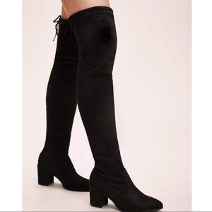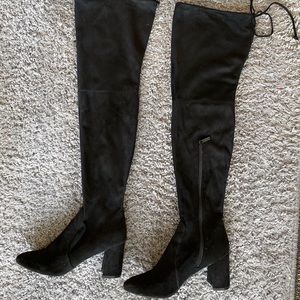 Black vegan suede over-the-knee boots with pointed toe and 2 inch heel. Super comfortable, only worn a few times! The top of the boot tightens with an adjustable draw string so it can fit any thigh! Zipper closure by ankle to get on/off really easily!