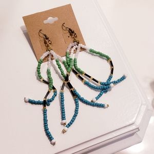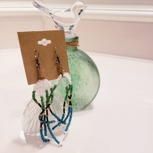 Tiny micro glass beads in blue, green, black, and white- strung into tentacles strands that hang or dangle.