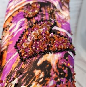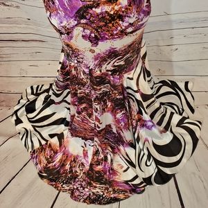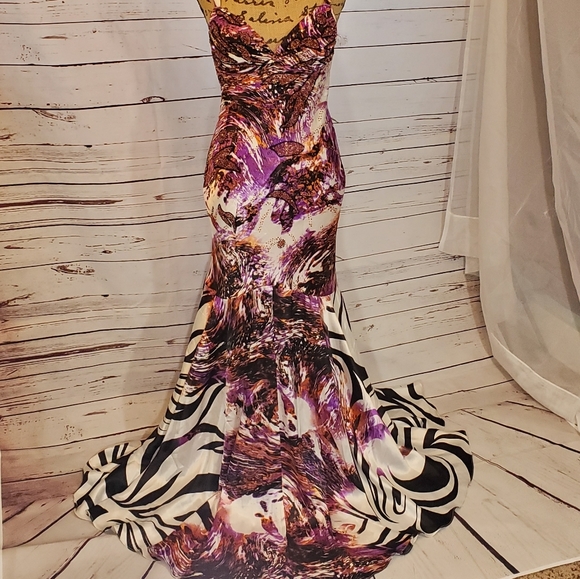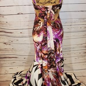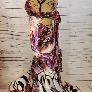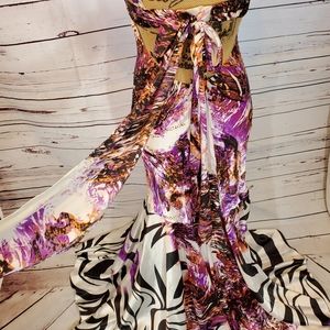 Mermaid-style dress with beautiful beadwork. Built-in bra. Straps are adjustable. Zippered back. Bra clasps in back (adjustable) and sash ties over the clasps to cover. Full skirt. Unique zebra markings. Plunging back. 100% Polyester. Lined. Satin finish. Professional spot clean only.