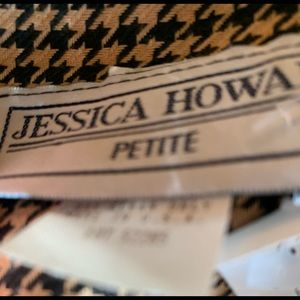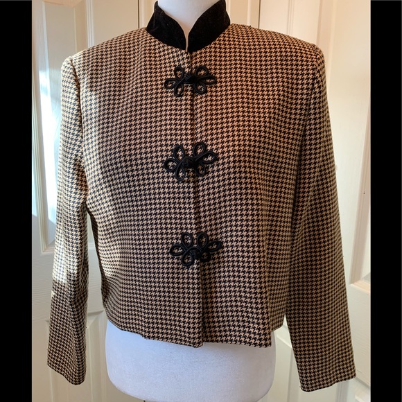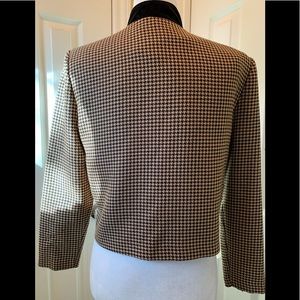 Jessica Howard Petite Mustard Yellow and Black Houndstooth with a velvet collar and gorgeous buttoning on this blazer or jacket. Such a cool way to add this color to your Spring/Summer Wardrobe.
