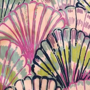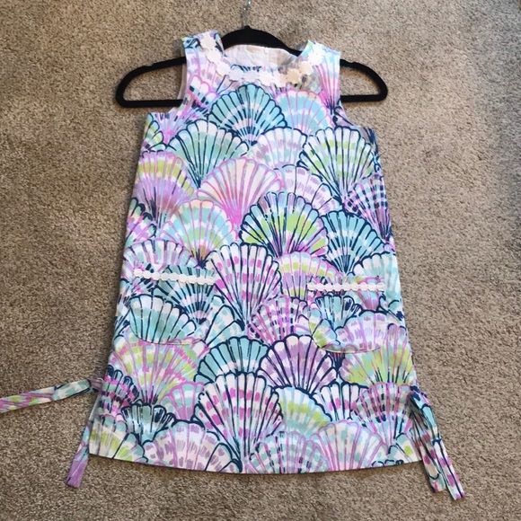 seashell patterned kids dress!! Has a cute seashell trim on the neckline + pockets!! Also has cute ties on the sides