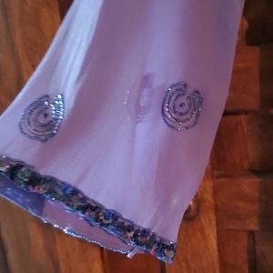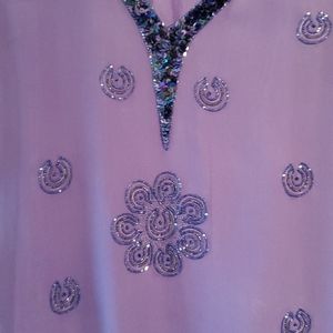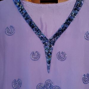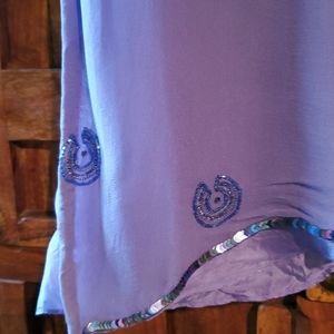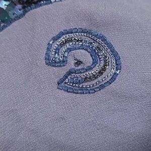 Beautifully beaded blouse. 3/4 sheer sleeves. Color blue, the pictures came purple. I don't know why, but it's more blue (like in the last picture). Small stains in the back and sleeves. High low front. There are no tags inside either small or medium. Measurements pit to pit 17",lenght pit down 18 " sleeve 21". Pre-owned worn.(4)