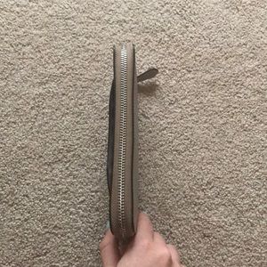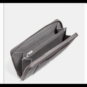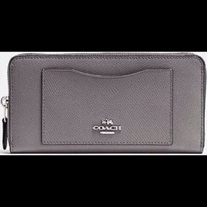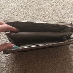 This is a brand new grey coach wallet. It was a gift but it’s just not my style. I still have the original box and wrapping. There is a small card holder on the front of the wallet. Also includes many compartments on the inside. The dimensions are 7.75 in x 4.25 in. Let me know if you have questions. Counter offers and questions welcome.