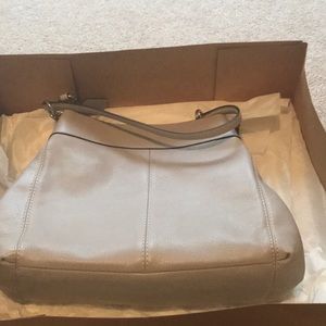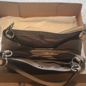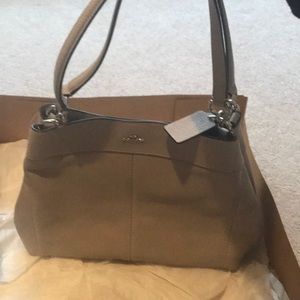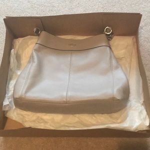 This is a brand new coach drop purse in a lavender color. Was part of a set with the wallet. About 14inches wide, multiple compartments on the inside. Original tags and box. Original price was 350$ selling for 120$ but I’m open to counter offers and questions. Let me know if you’re interested!