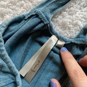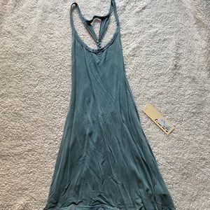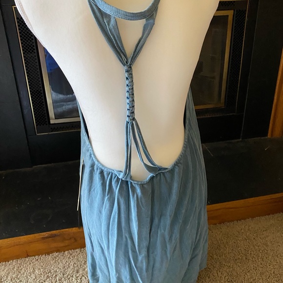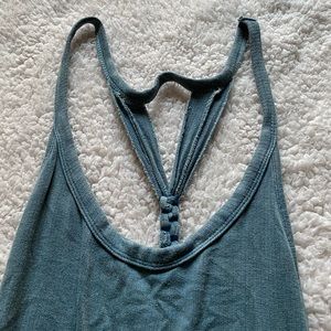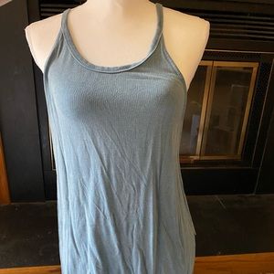 Adorable tank top cover up. I have the same one and wore it as a coverup over my swim suits on my cruise last summer. It’s got a very open back and it’s kinda like a dress it’s definitely a bit long for a tank top which is why I think it’s best as a cover up. Leightweight and very comfortable. Size large. Brand is mono b.