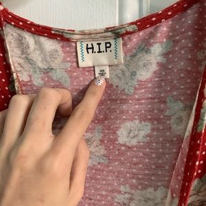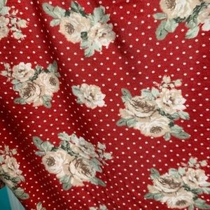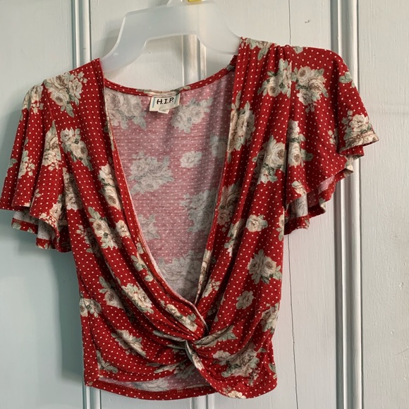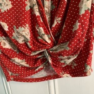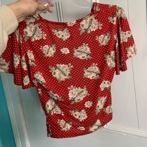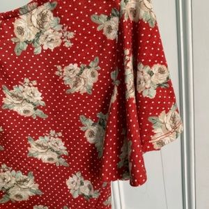 Cute red with floral and polka dots. Ruffled sleeves and rushing at the breasts.