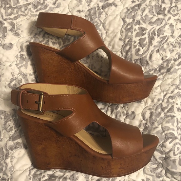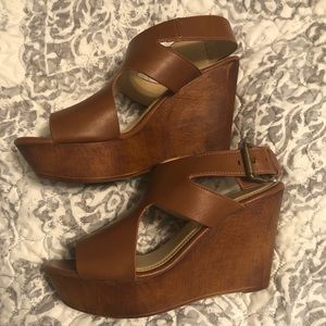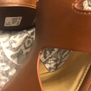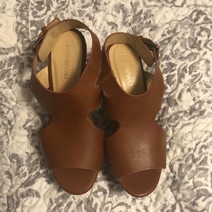 Lane Bryant platform wedges size 8 wide. The is a scuff on the right inner side of the heel. There is also a small tear on the left heel but it isn’t noticeable when the wedges are worn.