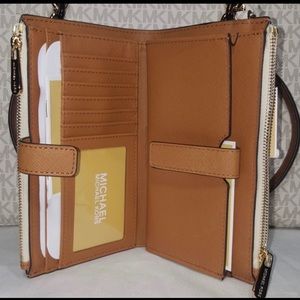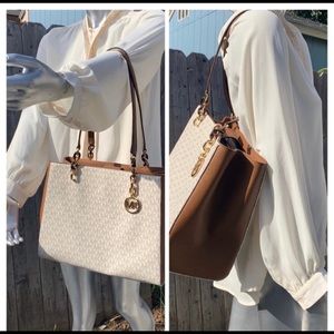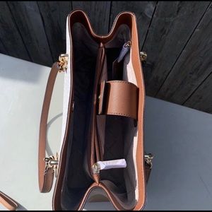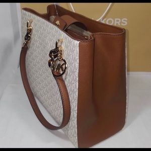 Beautiful New with tags set of Michael Kors handbag and wallet. Vanella/ brown color, purse measurements, 25” handle, 13” long, 6” wide, 10” tall, wallet measurements, 7” wide, 4 1/2 “ tall. Great deal :)