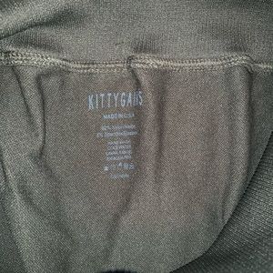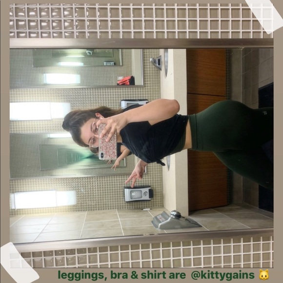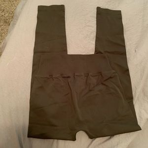 These are from the brand Kitty Gains. This is their seamless legging in One Size and the color is Olive Green. I’m a medium and they fit perfect. I’ve only worn these twice and they’re in excellent condition, they’re flattering but I just don’t like them for myself personally! They’re very stretchy and they’re compressive! DISCONTINUED LEGGING. Similar feel to gymshark seamless leggings.