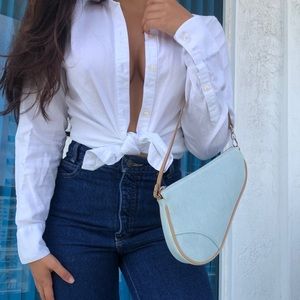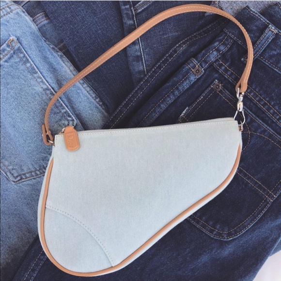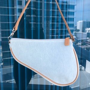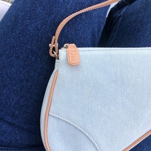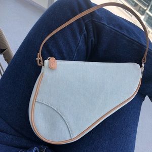 Dior saddle bag in light denim with beige leather trim and silver hardware. Excellent condition. Dustbag included.