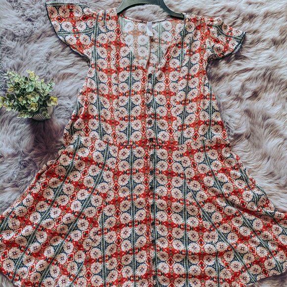 Short pattern boho style dress with buttons and hidden pockets on the hips.