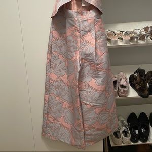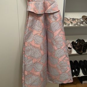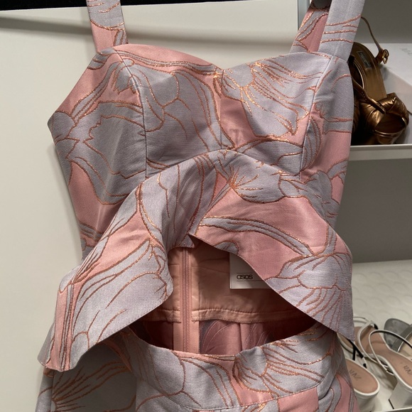 *SOLD**Cool and chic ASOS wide leg jumpsuit with a crop peplum style. Pretty pattern. Zip up in the back. Never worn before. Can be perfect for an occasion. Size 4. Cool detailing with a rose gold trim through out.
