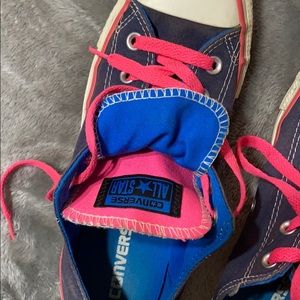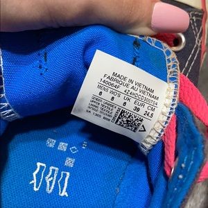 Unisex. Size 8 women’s Size 6 men’s. Shoe has multiple, colorful tongues. Slight fading near the top of shoe, but nothing extremely noticeable.