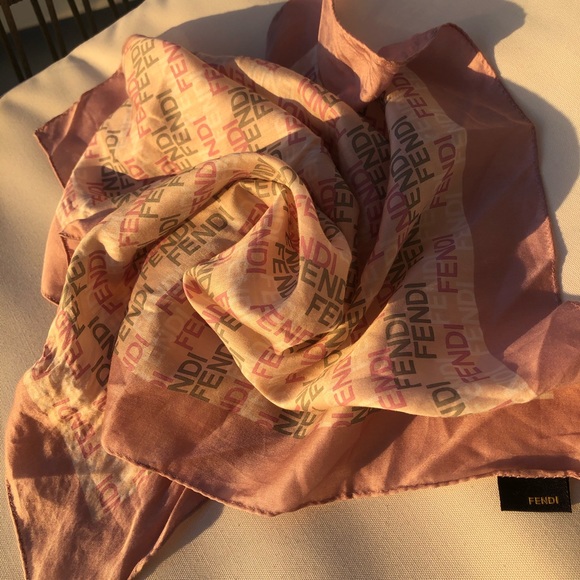 Adorable 100% cotton Fendi headscarf. Pink, lilac, cream, and gray are the colors that stamp the Fendi logo all over. Perfect as a bandana, hair tie, purse accessory, or facial covering. 19x19 inches.